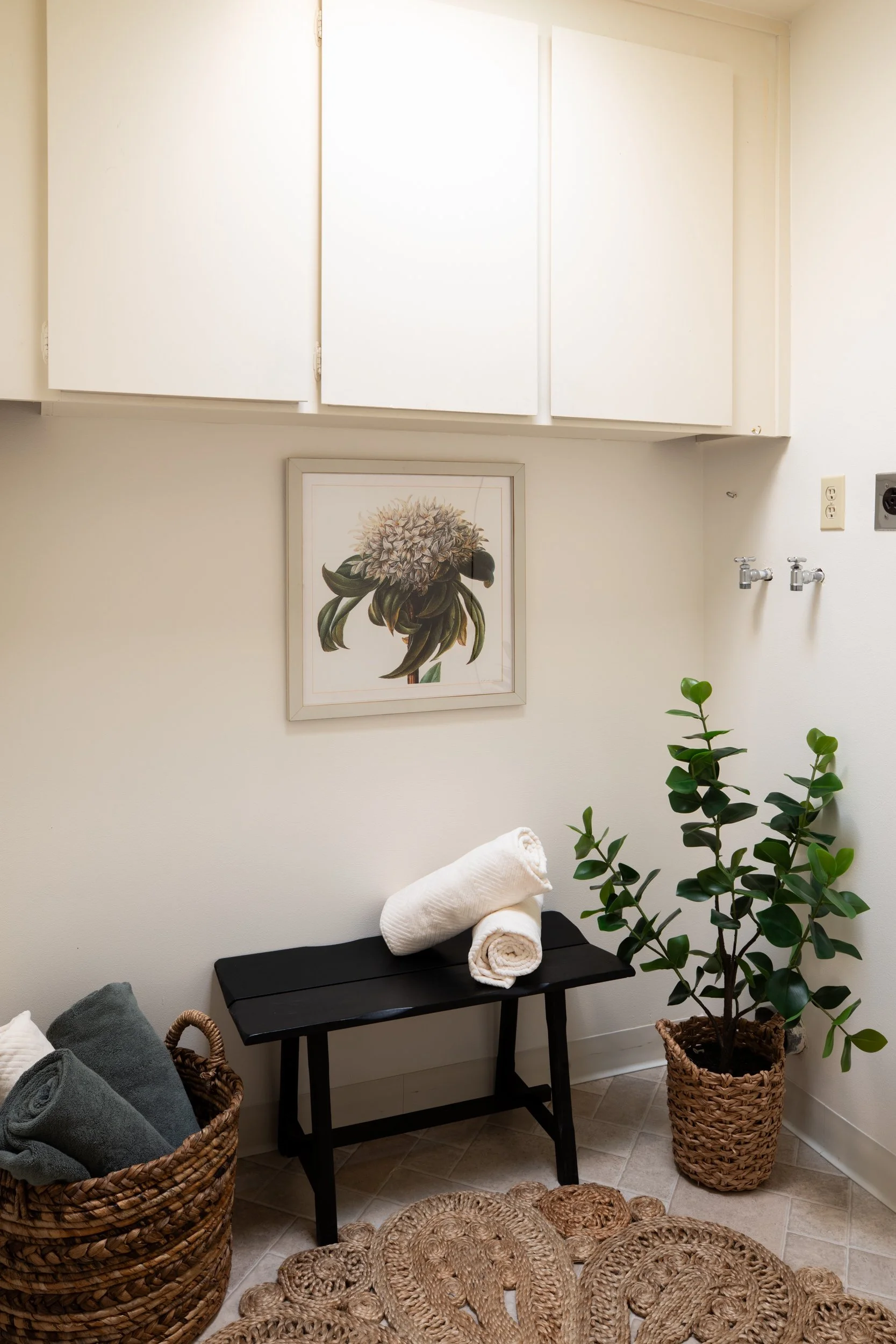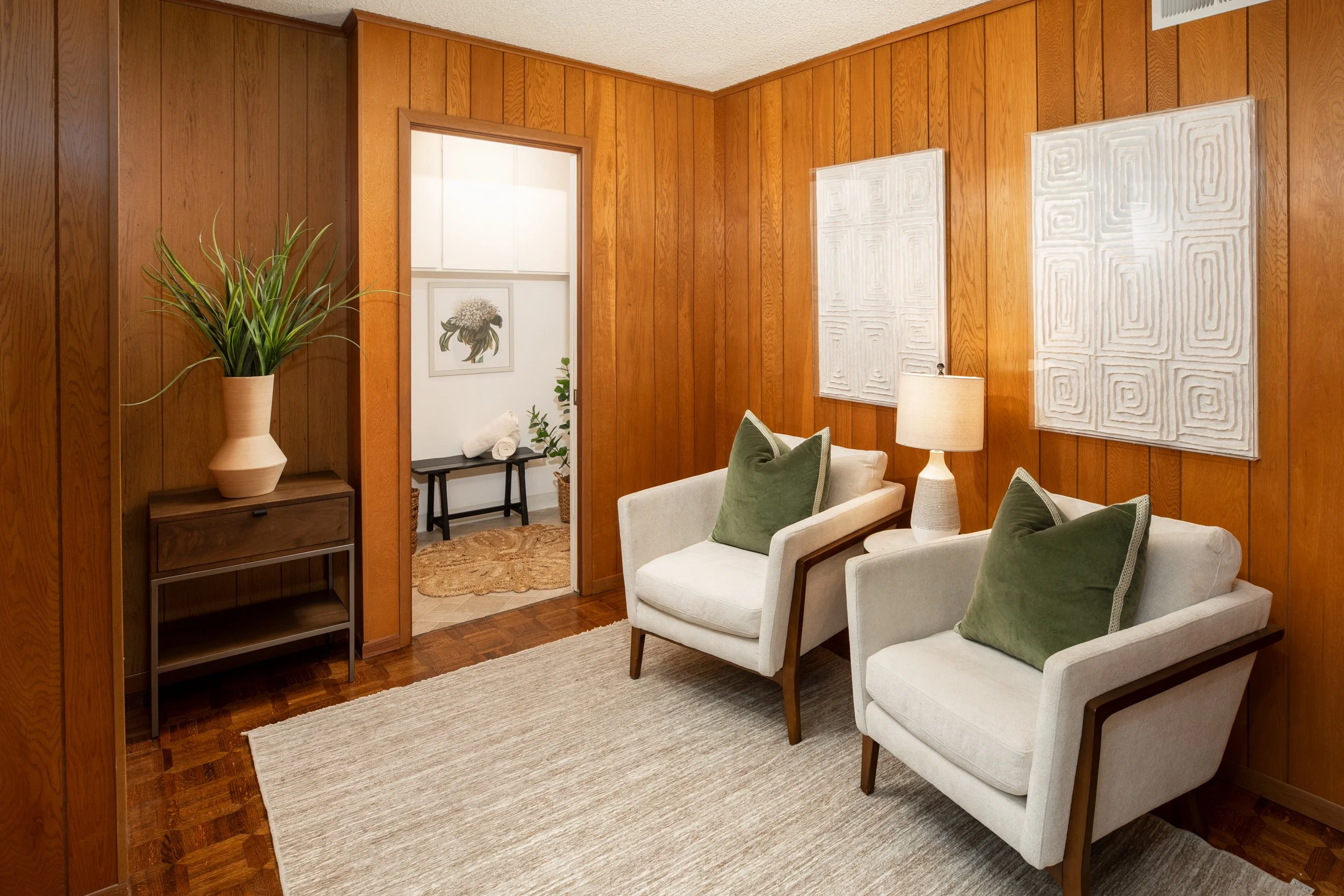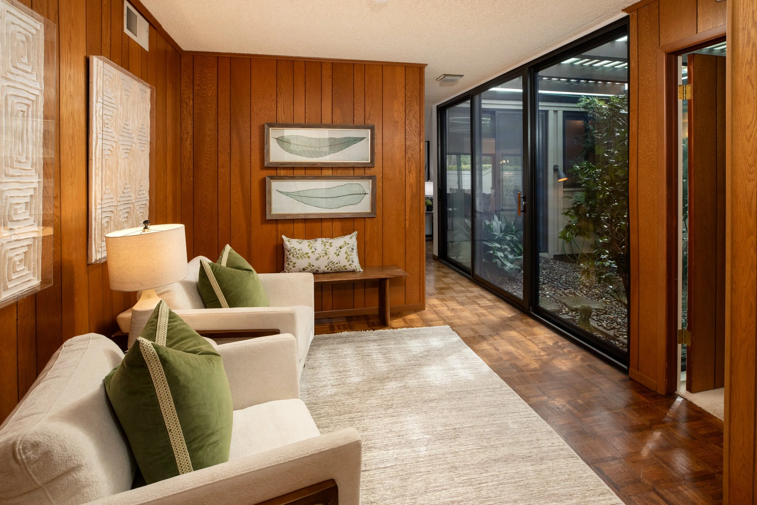Wood-panelled den for cozy relaxation or work-from-home convenience, and an interior laundry room with direct access to the attached garage